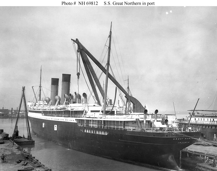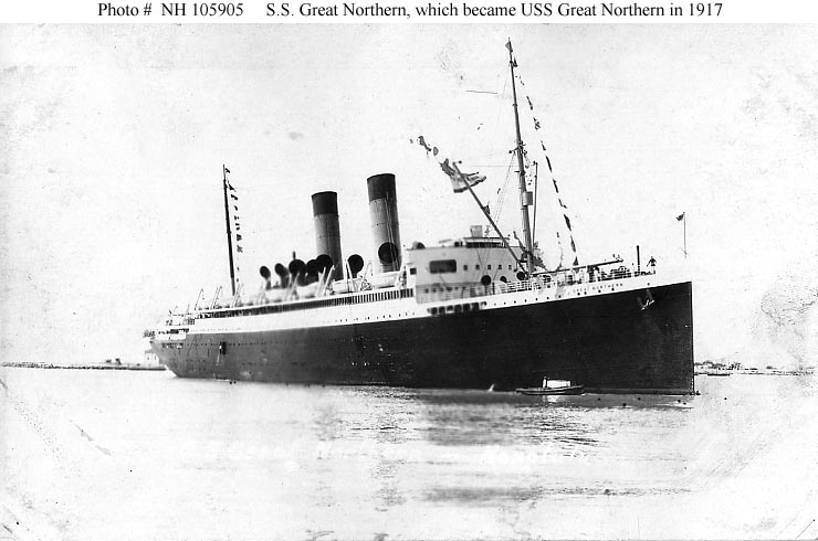 Photo #: NH 105905 S.S. Great Northern (American Passenger Liner, 1915) Photographed prior to 1917. This ship served as USS Great Northern (ID # 4569) in 1917-1919 and as USS Columbia (AG-9) in 1921-1922. The original photograph is printed on post card ("AZO") stock. Donation of Charles R. Haberlein Jr., 2008. U.S. Naval Historical Center Photograph. Online Image: 63KB; 740 x 490 pixels |