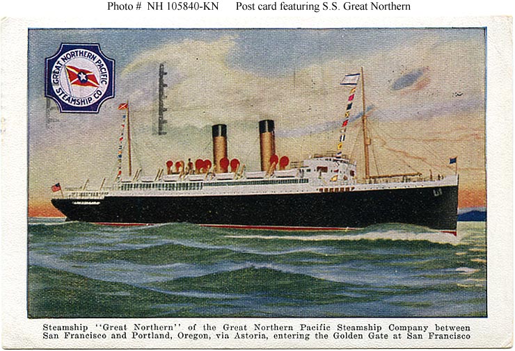 Photo #: NH 105840-KN (color) S.S. Great Northern (American Passenger Liner, 1915) Color-tinted post card, with an artwork of the ship entering the Golden Gate at San Francisco, California. It was published by the Great Northern Pacific Steamship Company for sending messages written on board. See Photo # NH 105840-A-KN for a view of the reverse side of this card, which was mailed at San Francisco, California, on 14 August 1916, with a message describing experiences on board Great Northern. This ship served as USS Great Northern (ID # 4569) in 1917-1919 and USS Columbia (AG-9) in 1921-1922. Donation of Charles R. Haberlein Jr., 2008. U.S. Naval Historical Center Photograph. Online Image: 117KB; 740 x 505 pixels |