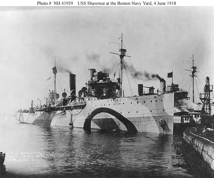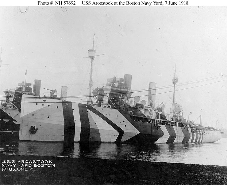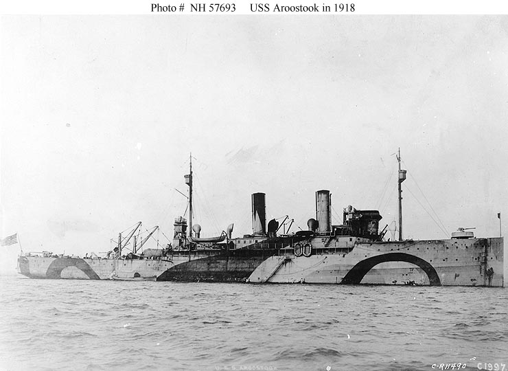 Photo #: NH 57693 USS Aroostook (ID # 1256) Photographed in 1918. Note her pattern camouflage, which was very similar to that of her sister ship, USS Shawmut (ID # 1255). Compare with Photo # NH 42398. U.S. Naval Historical Center Photograph. Online Image: 64KB; 740 x 540 pixels |