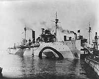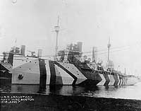 USS Aroostook, a 3,800-ton minelayer, was built in 1907 at Philadelphia, Pennsylvania, as the coastal passenger steamer Bunker Hill. She was acquired by the Navy in November 1917 and renamed within a few days. Placed in commission in December, she was converted to a "mine planter" at the Boston Navy Yard during the next several months. After a brief shakedown cruise, in mid-June 1918 Aroostook took on board a load of mines and began a voyage across the Atlantic Ocean in company with her sister minelayer Shawmut (ID # 1255). The trip, facilitated by the then-novel technique of refueling at sea, took her to Scotland, where in July she began laying thousands of mines in the North Sea to create a deadly barrier for transiting German submarines. This effort came to an end with the 11 November 1918 Armistice, and Aroostook returned home in December.