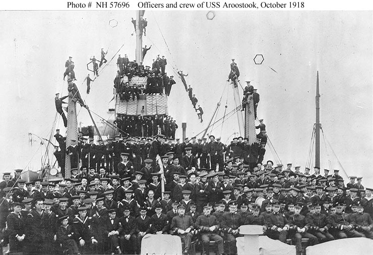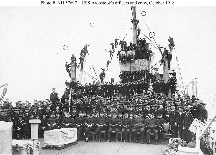 Photo #: NH 57696 USS Aroostook (ID # 1256) Ship's officers and crew, photographed on her after deck at Invergordan, Scotland, in October 1918. U.S. Naval Historical Center Photograph. Online Image: 98KB; 740 x 505 pixels |