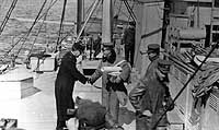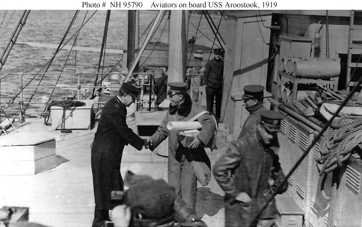 Photo #: NH 95790 Trans-Atlantic Flight of the "NC" Aircraft, May 1919 Captain James H. Tomb, Commanding Officer of USS Aroostook (ID # 1256), shakes hands with Lieutenant Commander Patrick N.L. Bellinger, on board the ship during an early state of the flight. Looking on is Commander Holden C. Richardson. Commander John Towers is walking away at right. U.S. Naval Historical Center Photograph. Online Image: 80KB; 740 x 465 pixels |
