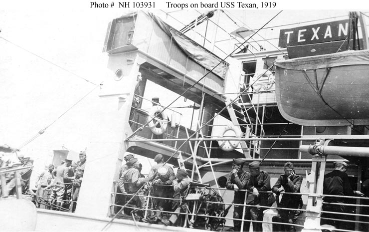 Photo #: NH 103931 USS Texan (ID # 1354) Troops and Sailors on deck amidships, while she was employed bringing servicemen home from Europe, 1919. The original image was printed on postal card ("AZO") stock. Donation of Dr. Mark Kulikowski, 2006. U.S. Naval History and Heritage Command Photograph. Online Image: 79KB; 740 x 465 pixels |