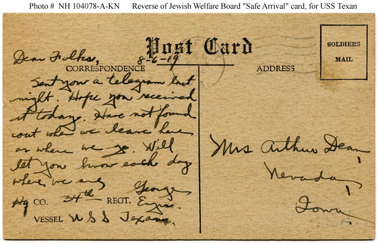 Photo #: NH 104078-A-KN (color) Jewish Welfare Board Post Card for Returning Troops, 1919 Reverse side of a card used by returning troops to report their arrival in the United States from Europe. This example was sent on 6 August 1919, reporting the arrival of a member of the 34th Engineer Regiment at Norfolk, Virginia, on USS Texan (ID # 1354). It was mailed to his mother, Mrs. Arthur Dean of Nevada, Iowa. The front side of this card is seen in Photo # NH 104078-KN. Donation of Dr. Mark Kulikowski, 2006. U.S. Naval History and Heritage Command Photograph. Online Image: 97KB; 740 x 475 pixels |