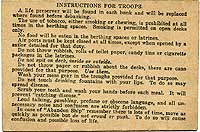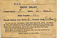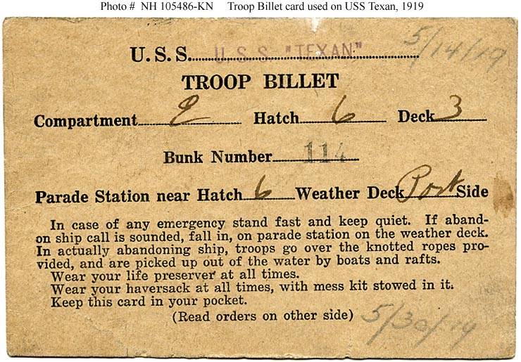 Photo #: NH 105486-A-KN (color) USS Texan (ID # 1354) Reverse side of a Troop Billet card, issued in May 1919 to troops embarked on Texan for passage home from France. This image is one of a group of items from the collection of a serviceman who apparently returned to the United States in USS Texan. See Photo # NH 105486-KN for the reverse side of this card. Donation of Dr. Mark Kulikowski, 2006. U.S. Naval History and Heritage Command Photograph. Online Image: 156KB; 740 x 515 pixels |