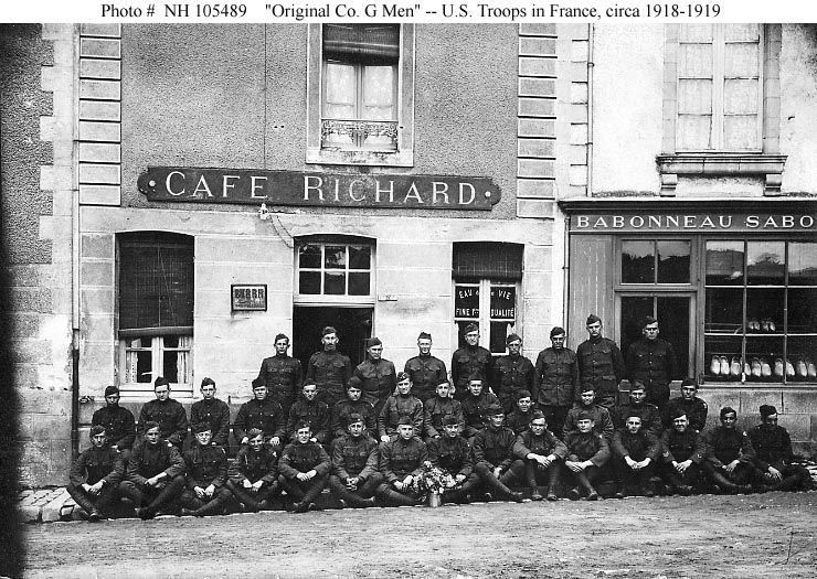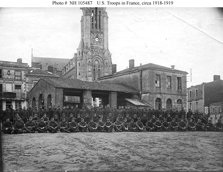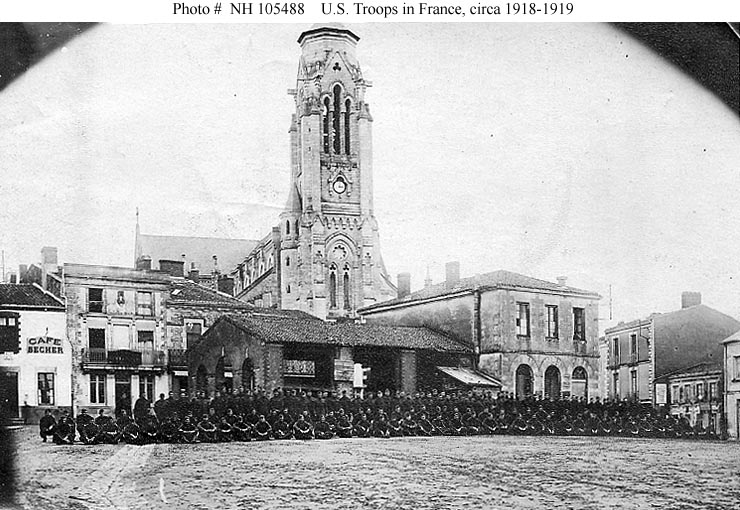 Related views: Photo #s NH 105487, NH 105488, NH 105489 and NH 105490 are images from the collection of a serviceman who apparently returned to the United States in USS Texan. Three of these views show groups of U.S. Soldiers in a French city. The other is of the waterfront of a southern European city, possibly on the French Mediterranean coast. All were taken circa 1918-1919.