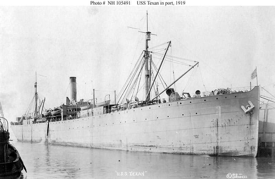 USS Texan, a 8615 gross ton cargo ship and troop transport, was built at Camden, New Jersey, in 1902 as S.S. Texan. She was acquired by the U.S. Navy in March 1918 and placed in commission as USS Texan (ID # 1354). Initially assigned to the Naval Overseas Transportation Service as a cargo ship, she made three round-trip voyages to France during the remaining months of World War I and another soon after the 11 November Armistice. Beginning in January 1919 Texan was converted to a troop transport and used to bring American veterans home from the former European war zone. She was decommissioned in August 1919 and turned over to the U.S. Shipping Board for return to her owners, the American-Hawaiian Steamship Company. S.S. Texan was sunk off Cuba on 11 March 1942 by the German submarine U-126.