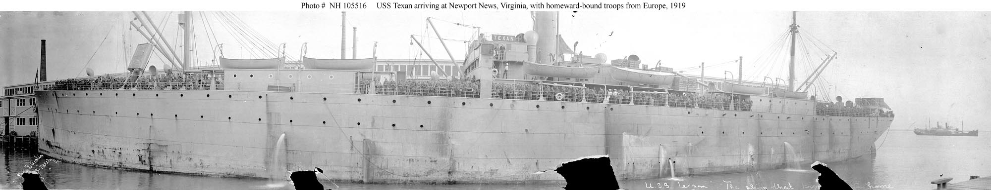 Photo #: NH 105516 USS Texan (ID # 1354) At Newport News, Virginia, with her decks crowded with troops arriving home from France, 1919. Panoramic photograph by the White (? -- name is only partially legible) Studio, Newport News. Donation of Charles R. Haberlein Jr., 2008. U.S. Naval History and Heritage Command Photograph. Online Image size: 95KB; 2000 x 385 pixels |