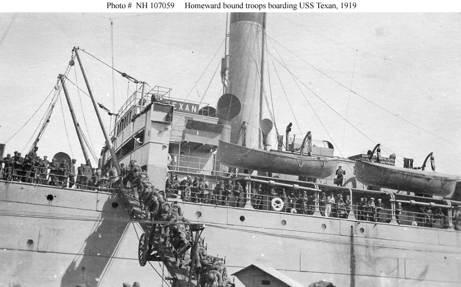 Photo #: NH 107059 USS Texan (ID # 1354) Homeward-bound troops boarding the ship at St. Nazaire, France, 1919. The original image is printed on post card ("AZO") stock. Donation of Dr. Mark Kulikowski, 2010. U.S. Naval History and Heritage Command Photograph. Online Image: 95KB; 900 x 560 pixels |