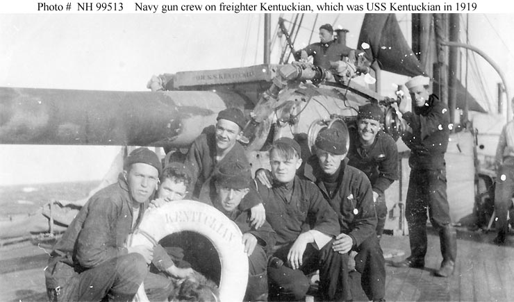 Photo #: NH 99513 S.S. Kentuckian (American Freighter, 1910) Navy Armed Guard gun crew poses by the ship's 5"/51 gun, circa 1917-1918. Note inscription on the gun's sight bar: "for S.S. Kentuckian". This ship served as USS Kentuckian (ID # 1544) in 1919. Courtesy of Don S. Montgomery, USN (Retired). U.S. Naval Historical Center Photograph. Online Image: 65KB; 740 x 435 pixels |