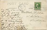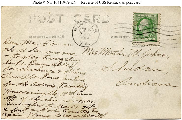 Photo #: NH 104119-A-KN (color) USS Kentuckian (ID # 1544) Post card, postmarked Norfolk, Virginia, 6 September 1919, sent by a serviceman to his mother, Mrs. Martha M. Johns of Sheridan, Indiana, upon his return to the United States from Europe. The front side of this card, with a photograph of USS Kentuckian arriving in a U.S. Port, is seen in Photo # NH 104119. Donation of Dr. Mark Kulikowski, 2006. U.S. Naval Historical Center Photograph. Online Image: 90KB; 740 x 490 pixels |