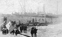 Photo #: NH 104119 USS Kentuckian (ID # 1544) Arriving in a U.S. port, while transporting U.S. troops home from Europe in 1919. The original image is printed on a post card sent by a serviceman to his mother, Mrs. Martha M. Johns of Sheridan, Indiana. It is postmarked Norfolk, Virginia, 6 September 1919. Note the flags (among them a Salvation Army banner) carried by women waiting on the pier. The reverse side of this card is seen in Photo # NH 104119-A-KN. Donation of Dr. Mark Kulikowski, 2006. U.S. Naval Historical Center Photograph. Online Image: 69KB; 740 x 465 pixels |