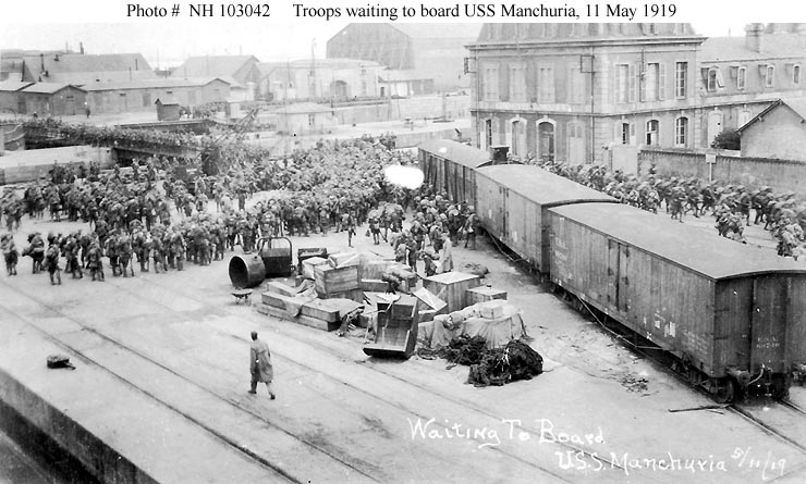 Troops waiting to board the ship in a French port, 11 May 1919.