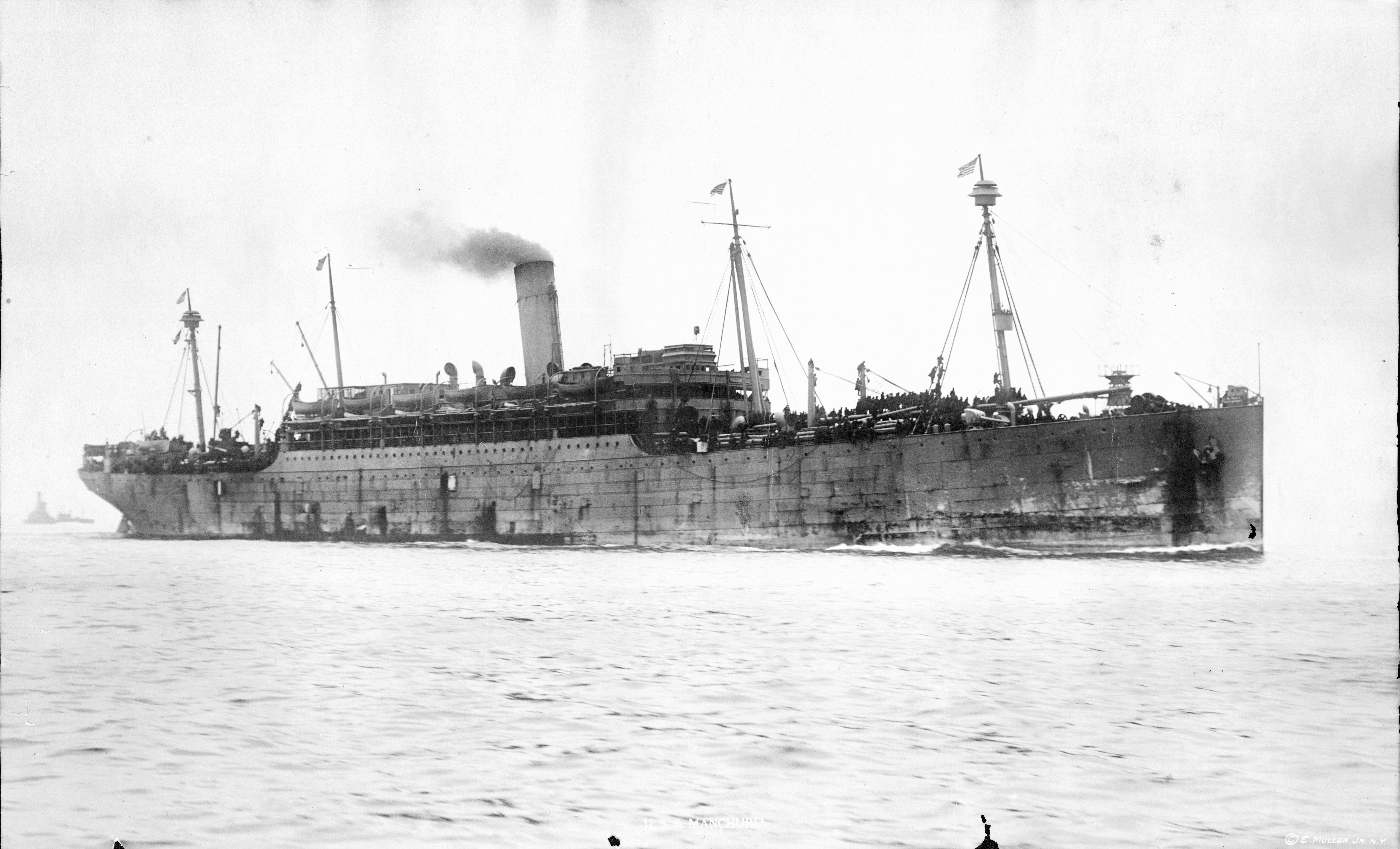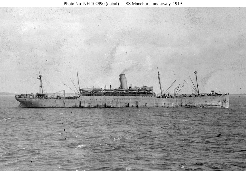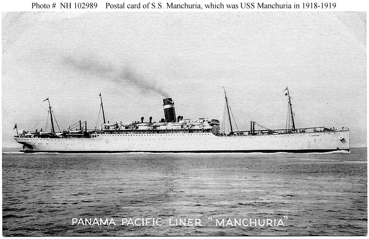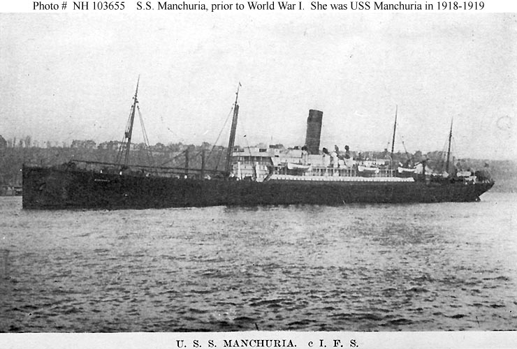 USS Manchuria, a 13,638 gross ton troop transport, was built at Camden, New Jersey, in 1904 as the commercial passenger steamer of the same name. She was taken over by the Navy in April 1918 and placed in commission later in that month. During the rest of World War I she made five voyages to France, carrying American service personnel to the European war zone. After the November 1918 Armistice ended the fighting, Manchuria began bringing veterans home, making nine trips from France to the United States for this purpose. The last of these ended at New York in late August 1919. The ship was decommissioned there in September and returned to her owner.
