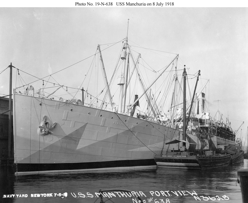 Photo #: NH 46624 USS Manchuria (ID # 1633) Tied up at New York City, 8 July 1918, after having been painted in pattern camouflage. U.S. Naval History and Heritage Command Photograph. Online Image: 83KB; 740 x 570 pixels |