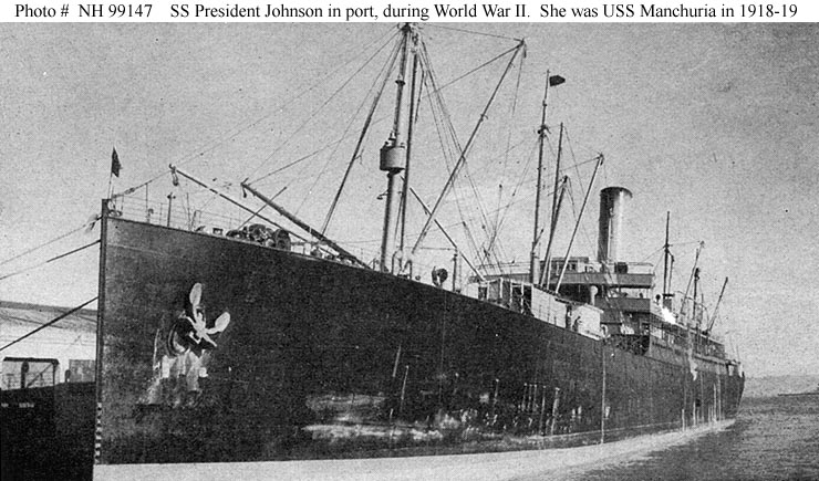 Photo #: NH 99147 SS President Johnson (American Passenger Steamship, 1904) Halftone reproduction of a photograph taken in port during the World War II era. Originally named Manchuria, this ship served as USS Manchuria (ID # 1633) in 1918-1919 and was employed as a civilian-manned troopship during World War II. Copied from the book "Troopships of World War II", by Roland W. Charles. U.S. Naval History and Heritage Command Photograph. Online Image: 92KB; 740 x 435 pixels |