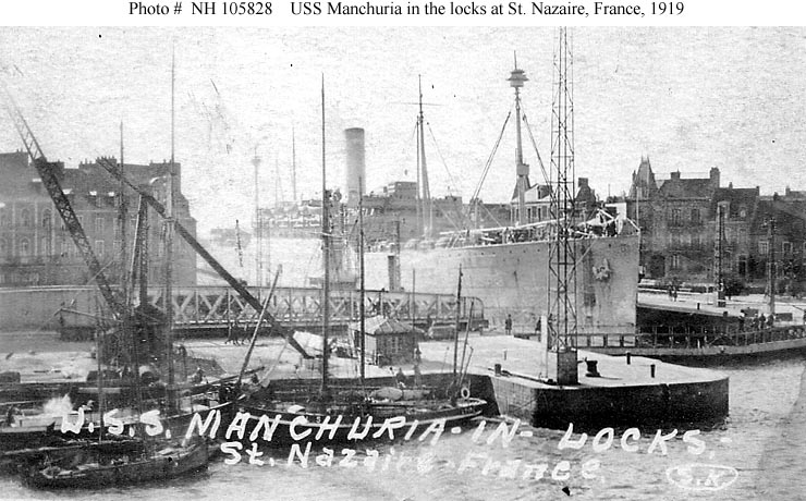 Photo #: NH 105828 USS Manchuria (ID # 1633) In the locks at St. Nazaire, France, 1919. Her guns are still on board. The original image is printed on post card ("AZO") stock. Donation of Charles R. Haberlein Jr., 2008. U.S. Naval History and Heritage Command Photograph. Online Image: 95KB; 740 x 460 pixels |