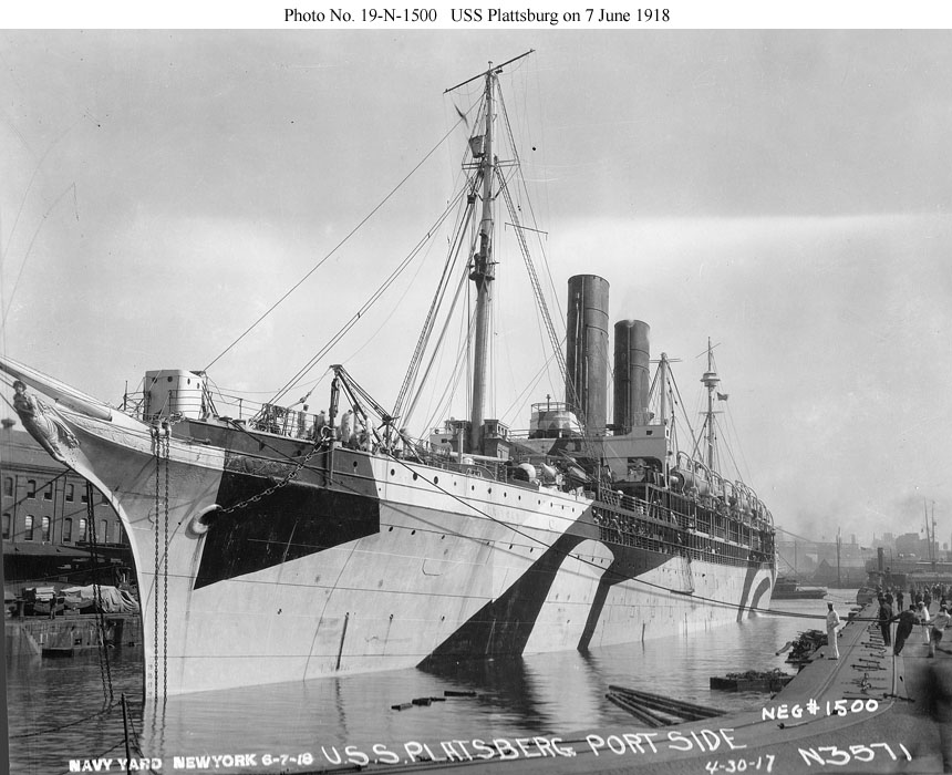 Photo #: 19-N-1500 USS Plattsburg (ID # 1645) At the New York Navy Yard on 7 June 1918, shortly before her first trans-Atlantic voyage as a U.S. Navy ship. She has been freshly painted in pattern camouflage. Source: U.S. National Archives, RG-19-N box 56, also U.S. Naval History and Heritage Command Photograph NH 43047. |