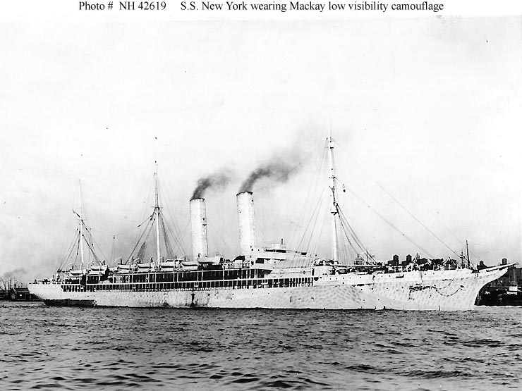 Photo #: NH 42619 S.S. New York (American Passenger Liner, 1888) Painted in Mackay "low visibility" camouflage, while operating as a transport in 1917. She later became USS Plattsburg (ID # 1645). Courtesy of International Mercantile Marine Company, New York. U.S. Naval History and Heritage Command Photograph. Online Image: 79KB; 740 x 555 pixels |