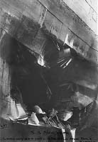Photo #: NH 45137 S.S. New York (American Passenger Liner, 1888) Mine damage to the ship's port side, forward, received on 9 April 1917, while she was approaching Liverpool, England, at the end of a trans-Atlantic trip. Photographed by H. Dowden on 12 April, while New York was in drydock at Liverpool. The view looks aft from the dock's floor. U.S. Naval History and Heritage Command Photograph. Online Image: 73KB; 510 x 765 pixels |