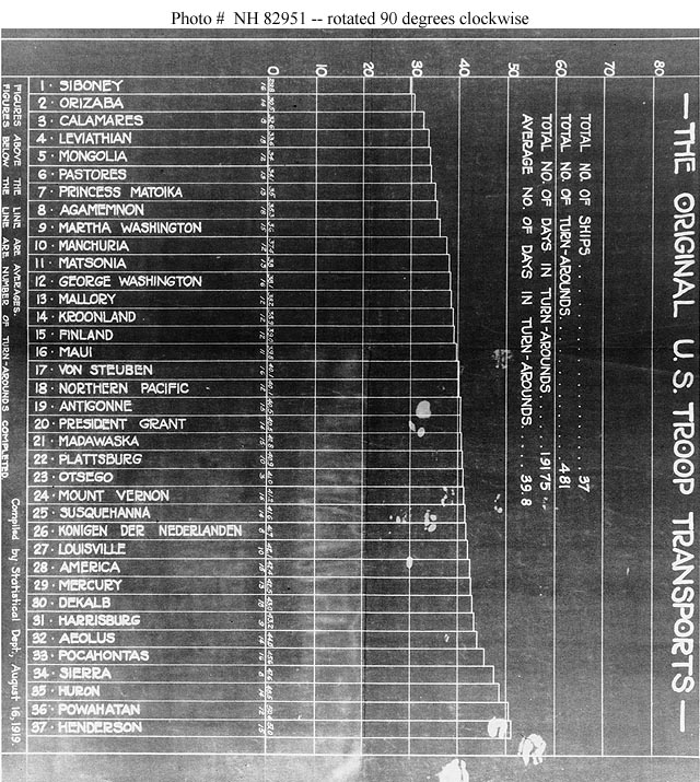 Photo #: NH 82951 "The Original U.S. Troop Transports" Chart compiled 16 August 1919, showing the number of trans-Atlantic "turn arounds" and their average duration for thirty seven U.S. Navy troop transports employed during and immediately after World War I. Collection of the USS Pocahontas Reunion Association, 1974. U.S. Naval History and Heritage Command Photograph. Online Image: 157KB; 690 x 655 pixels Click here to rotate chart 90 degrees clockwise |