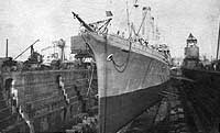 Photo #: NH 45136 S.S. New York (American Passenger Liner, 1888) In drydock at Liverpool, England, on 12 April 1917, showing mine damage received on 9 April, while she was approaching Liverpool at the end of a trans-Atlantic trip. Among the ship's passengers on this voyage was Rear Admiral William S. Sims, USN, who was assigned to the British Admiralty as the U.S. Navy's representative. Note the large hole in New York's hull side below the waterline, the U.S. flag neutrality marking (the United States had entered World War I after the ship began this trip), and her forward port side deck gun. Photographed by H. Dowden. U.S. Naval History and Heritage Command Photograph. Online Image: 80KB; 525 x 765 pixels |