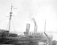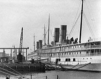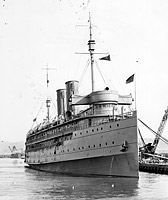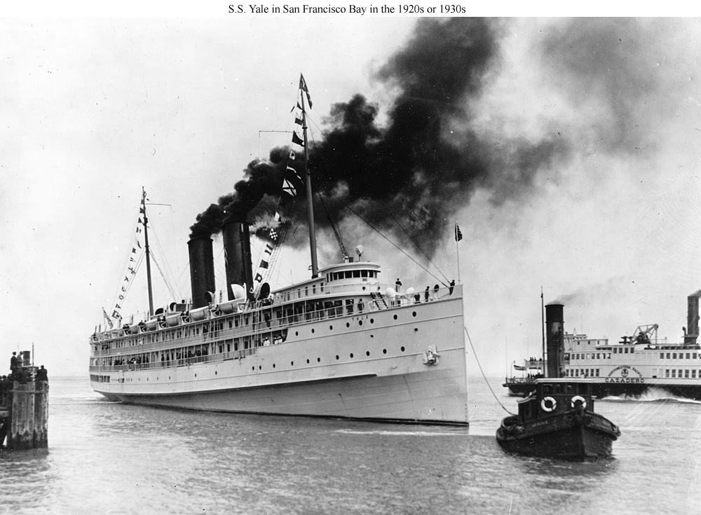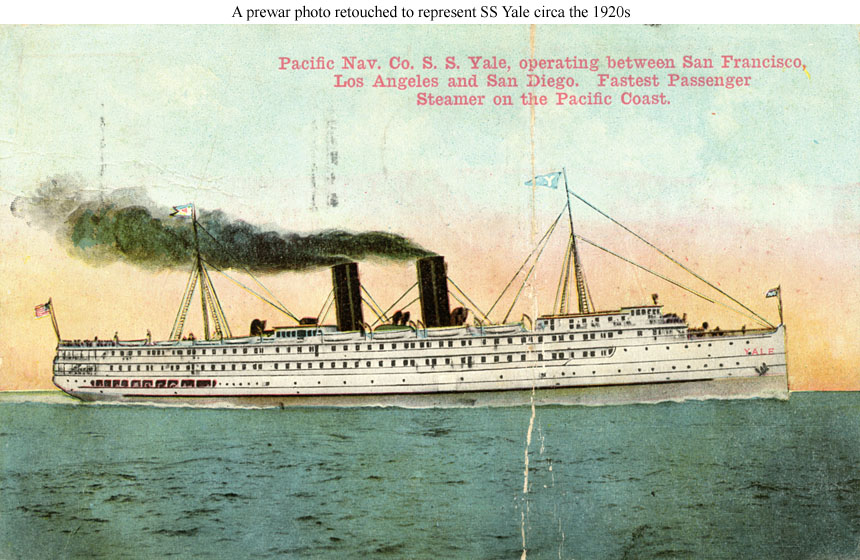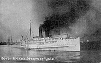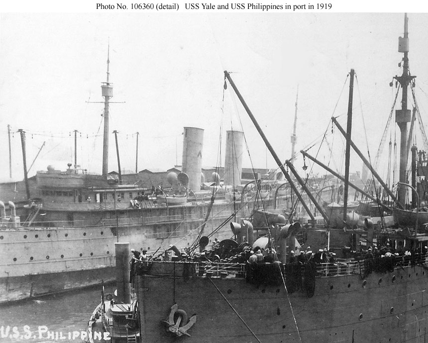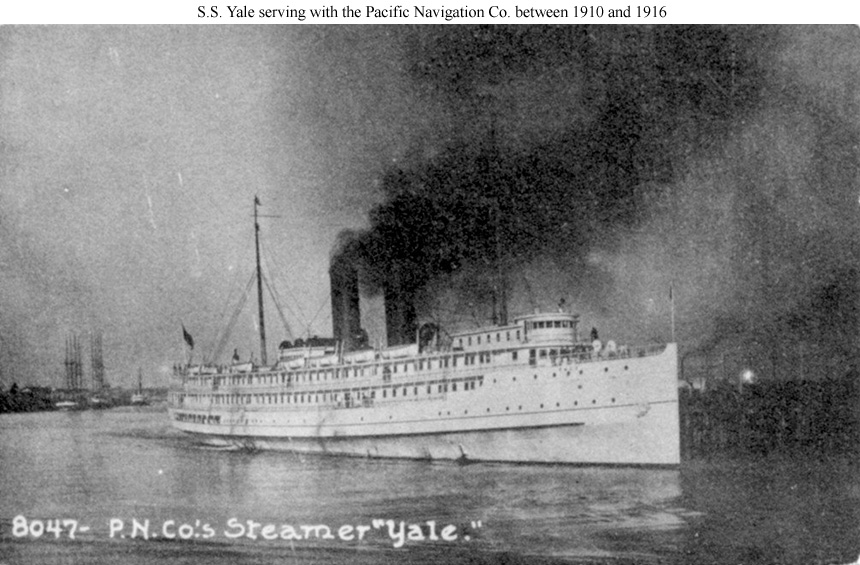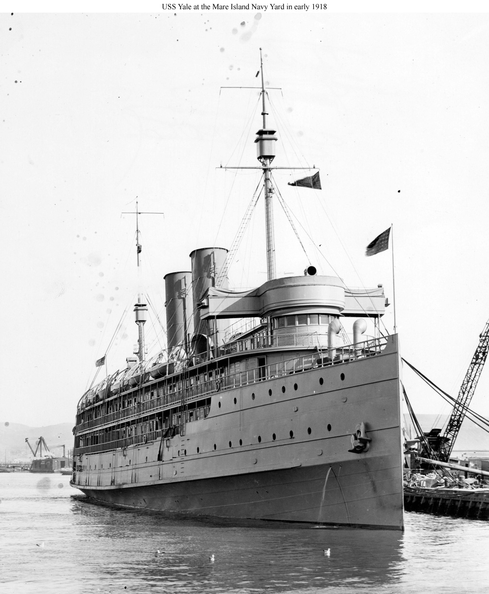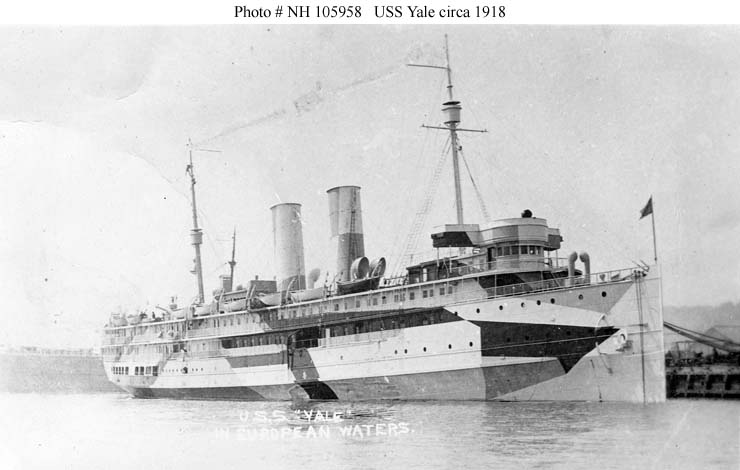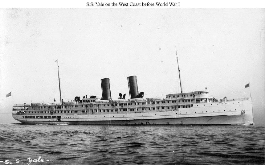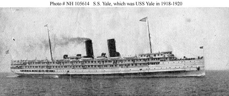S.S. Yale, a 3731 gross ton coastal passenger ship, was built by the Delaware River Shipbuilding Company in 1906. In March 1918 the U.S. Navy acquired her from the Pacific Steamship Company of Seattle, Washington, placing her in commission later in that month as USS Yale (ID # 1672). Following shipyard work at Mare Island, California, to suit her for employment as a coastal troop transport, she carried Marines to Nicaragua in May, then continued on to the East Coast by way of the Panama Canal. Yale steamed across the Atlantic in July 1918 and began service carrying troops and other passengers between southern England and English Channel ports in France. This important work continued for the remainder of World War I and for several months after the 11 November 1918 Armistice. Returning to the U.S. in May 1919, she conducted passenger operations along the Eastern Seaboard for three more months. USS Yale was decommissioned in early September 1919 and, in June 1920, sold for commercial operation along the Pacific Coast.