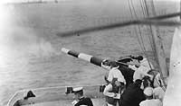 With a U.S. Marine Corps Lieutenant (perhaps Lt. Fegan), on board
