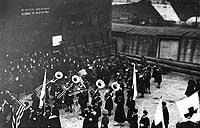 A U.S. Army band and Red Cross workers welcome troops home, as