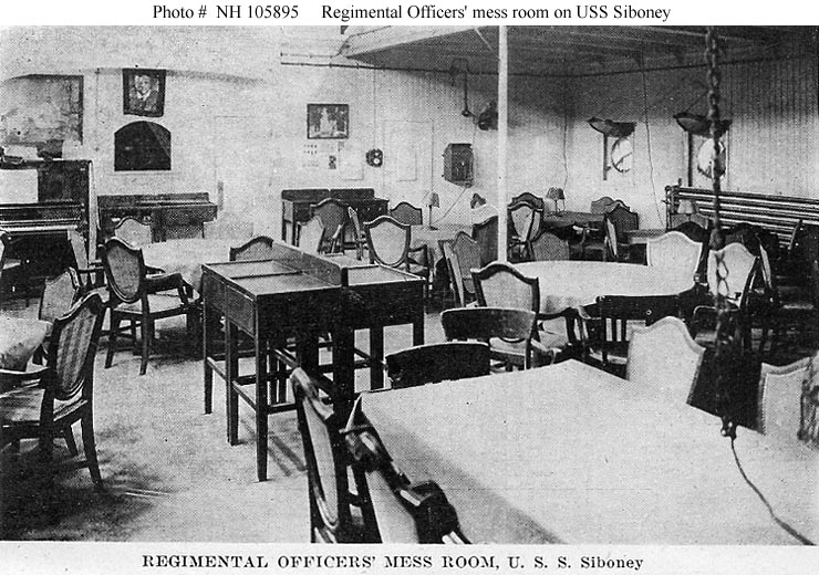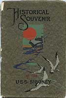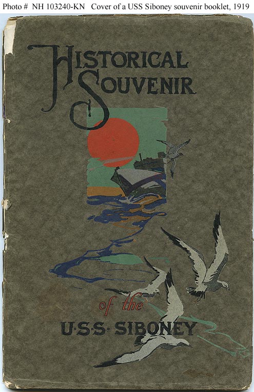 Photo #: NH 103240-KN (color) USS Siboney (ID # 2999) Front cover of the "Historical Souvenir of the U.S.S. Siboney", published by the ship's crew in 1919 as a momento of her service. This paperbound booklet contains a history of Siboney from her commissioning on 8 April 1918 until July 1919, about a month before she was decommissioned, plus complete rosters of the ship's officers and crew. It also features photographs and artworks related to the ship, with the latter including many fine pen and ink portraits of her officers by Musician Loren C. Holmberg, USN. Collection of Captain Clarence S. Williams, USN. Donated by Mrs. Clarence S. Williams, 1975. U.S. Naval History and Heritage Command Photograph. Online Image: 96KB; 495 x 765 pixels |