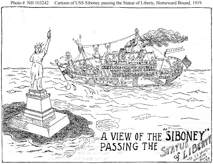 Photo #: NH 103242 USS Siboney (ID # 2999) Cartoon by Private C.A. Skoog, U.S. Army, depicting the ship passing the Statue of Liberty at the conclusion of a homeward bound voyage from France, 1919. It was published in the ship's newspaper, the "Siboney Signal", on page 6 of the 1 September 1919 issue. Collection of Captain Clarence S. Williams, USN. Donated by Mrs. Clarence S. Williams, 1975. U.S. Naval History and Heritage Command Photograph. Online Image: 157KB; 740 x 570 pixels |