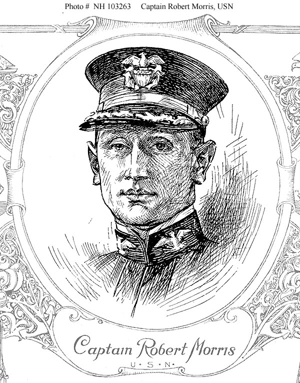 Photo #: NH 103263 Captain Robert Morris, USN, Commanding Officer, USS Siboney (ID # 2999), 1918-1919 Reproduction of a pen and ink sketch portrait by Musician Loren C. Holmberg, USN, printed on page 4 of "Historical Souvenir of the U.S.S. Siboney", published by the ship's crew in 1919 as a momento of her service. Collection of Captain Clarence S. Williams, USN. Donated by Mrs. Clarence S. Williams, 1975. U.S. Naval History and Heritage Command Photograph. Online Image: 179KB; 600 x 765 pixels |
