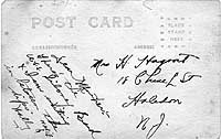 Photo #: NH 103874-A USS Siboney (ID # 2999) Reverse side of the original print for NH 103874, with a message written by U.S. Navy Musician Wallace W. Andringa to his mother-in-law. See Photo # NH 103874 for a reproduction of the front of the original post card stock print, featuring a photograph of USS Siboney's band, of which Musician Andringa was a member. Courtesy of Thomas Andringa, 2006. U.S. Naval History and Heritage Command Photograph. Online Image: 81KB; 740 X 490 pixels |