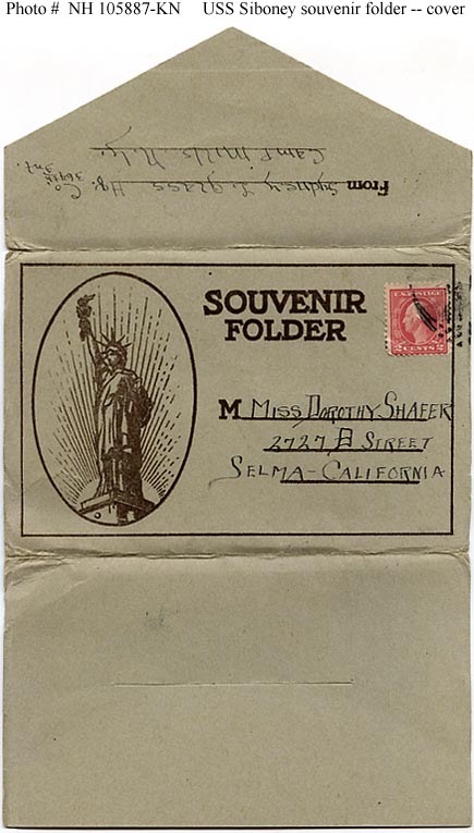 Photo #: NH 105887-KN (color) USS Siboney (ID # 2999) "Souvenir Folder" published in 1919, featuring ten halftone reproductions of photographs of and on board the ship. It was mailed by Sydney L. Glass, a Soldier stationed at Camp Mills, New York, who may have been a passenger on Siboney in 1919. The individual photographs in this "Souvenir Folder" have Photo #s NH 105888, NH 105889, NH 105890, NH 105891, NH 105892, NH 105893, NH 105894, NH 105895, NH 105896, and NH 105897. Donation of Dr. Mark Kulikowski, 2008. U.S. Naval History and Heritage Command Photograph. Online Image: 64KB; 435 x 765 pixels |