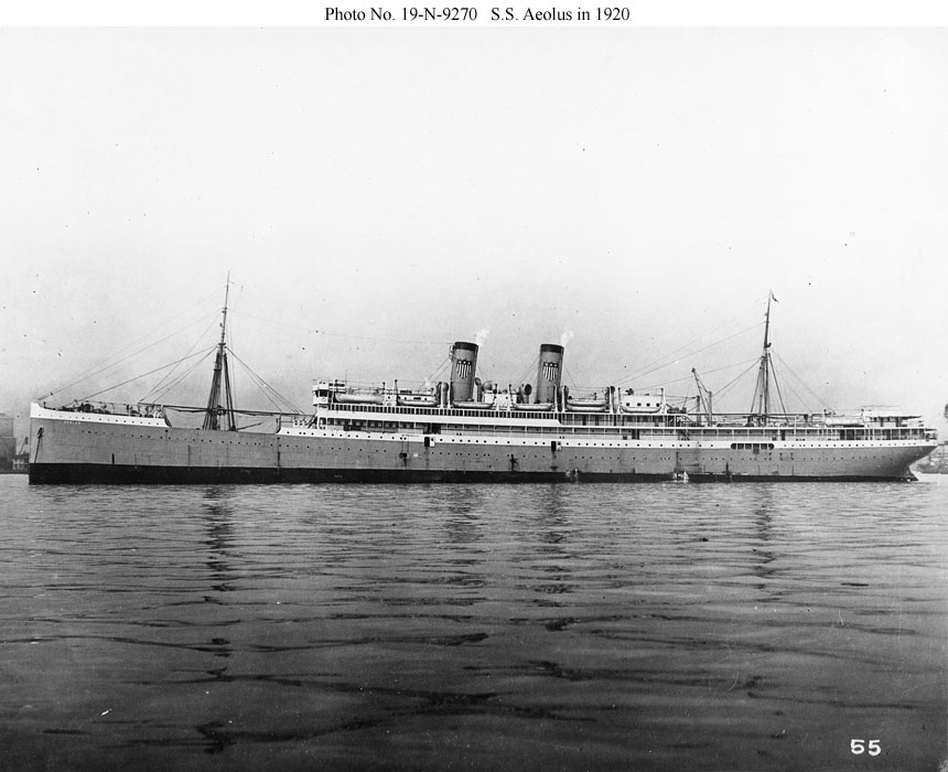 Photo #: 19-N-9270 S.S. Aeolus (American passenger ship, 1899) Photographed in 1920 after being rebuilt by the U.S. Shipping Board for commercial service. She is wearing Shipping Board stack markings. This ship became S.S. City of Los Angeles in 1922. Source: U.S. National Archives, RG-19-N box 56. |
