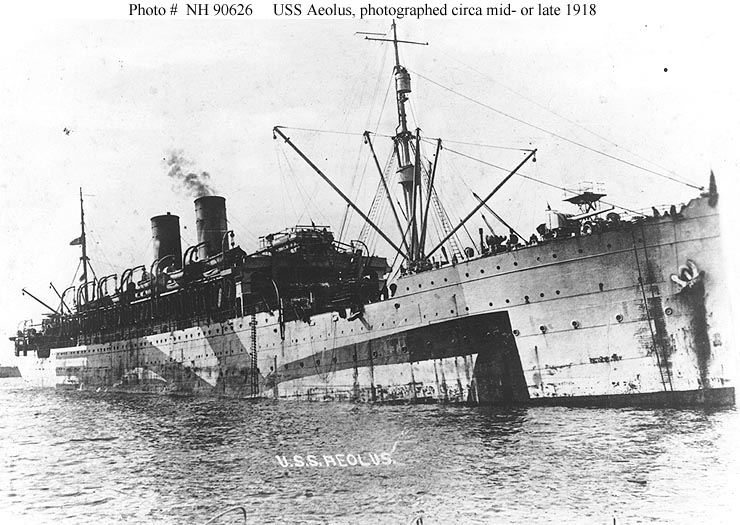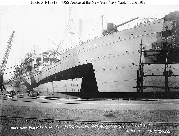 Photo #: NH 90626 USS Aeolus (ID # 3005) Photographed circa mid- or late 1918, after her "dazzle" camouflage had weathered considerably. Courtesy of Raymond O. Draves, 1980. U.S. Naval History and Heritage Command Photograph. Online Image: 102KB; 740 x 525 pixels |