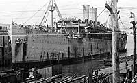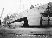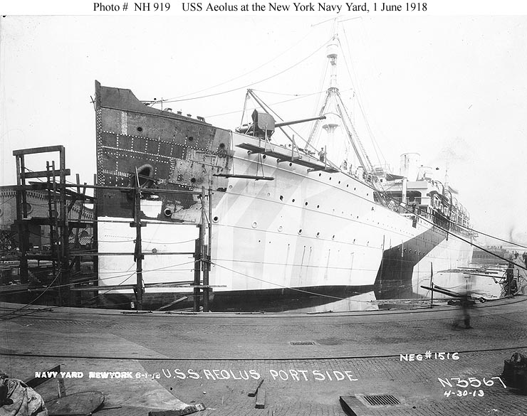 Photo #: NH 918 USS Aeolus (ID # 3005) In dry dock at the New York Navy Yard, Brooklyn, New York, on 1 June 1918, while completing repair of damage received in a collision with USS Huron on 25 April 1918. Note unpainted plating at her bow and the ship's "dazzle" camouflage scheme. U.S. Naval History and Heritage Command Photograph. Online Image: 105KB; 740 x 565 pixels |