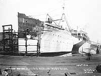 Photo #: NH 919 USS Aeolus (ID # 3005) In dry dock at the New York Navy Yard, Brooklyn, New York, on 1 June 1918, while completing repair of damage received in a collision with USS Huron on 25 April 1918. Note unpainted plating at her bow and the ship's "dazzle" camouflage scheme. U.S. Naval History and Heritage Command Photograph. Online Image: 103KB; 740 x 585 pixels |
