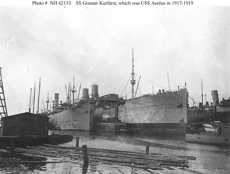 Photo #: NH 42153 SS Grosser Kurfürst (German Passenger Steamship, 1899) Interned in the New York City area, circa 1917. Seized by the United States Government in April 1917, she served as USS Aeolus (ID # 3005) during 1917-1919. Grosser Kurfürst is the larger ship, in the center of the view. U.S. Naval History and Heritage Command Photograph. Online Image: 81KB; 740 x 560 pixels |