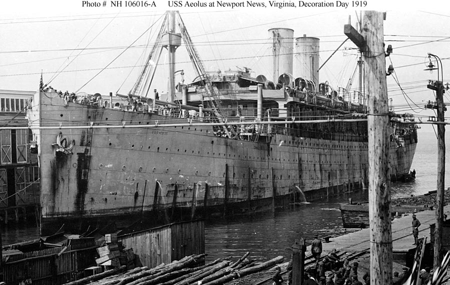 Photo #: NH 106016-A USS Aeolus (ID # 3005) At Newport News, Virginia, 31 May 1919, after disembarking troops of the 350th Infantry. Cropped from NH 106016, a panoramic photograph by Clements, 619 F. St. NW, Washington, D.C., entitled "350th Infantry Arriving Newport News, Va. Decoration Day 1919". Donation of Dr. Mark Kulikowski, 2008. U.S. Naval History and Heritage Command Photograph. Online Image: 133KB; 900 x 570 pixels |