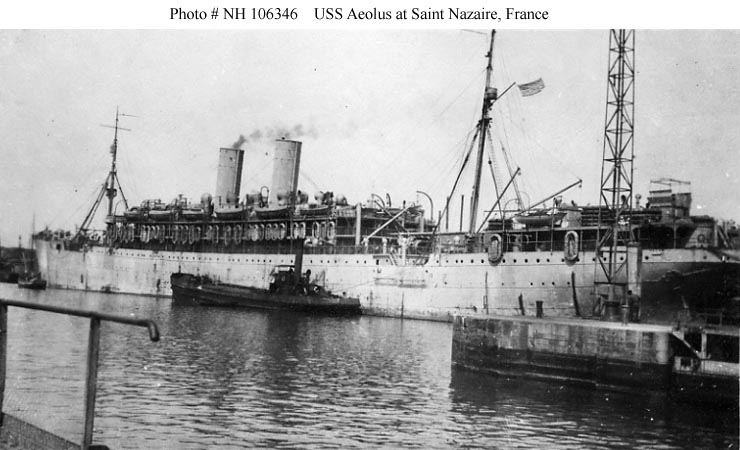 Photo #: NH 106346 USS Aeolus (ID # 3005) At St. Nazaire, France in 1919. Photograph from the collection of Robert H. Helm, donated by Mr. & Mrs. Robert Helm, 2008. U.S. Naval History and Heritage Command Photograph. Online Image: 67KB; 740 x 450 pixels |