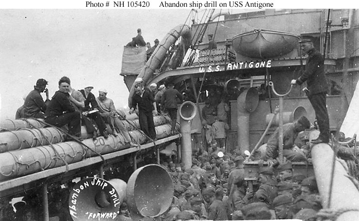 Abandon ship drill on board, circa 1917-1919. The photo looks