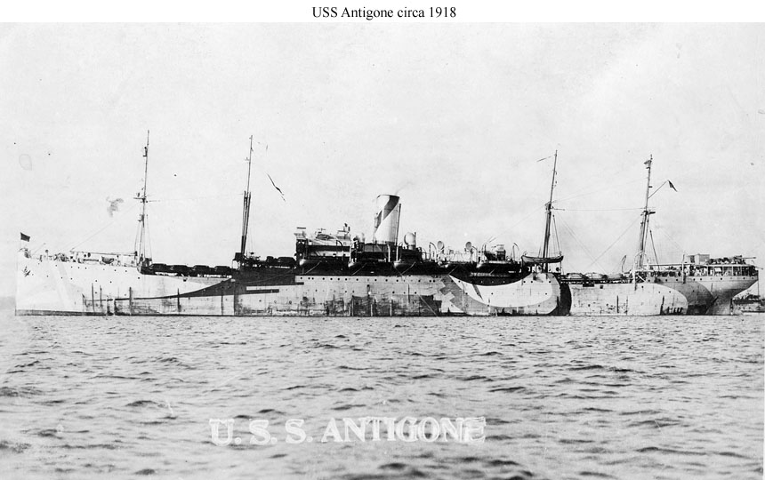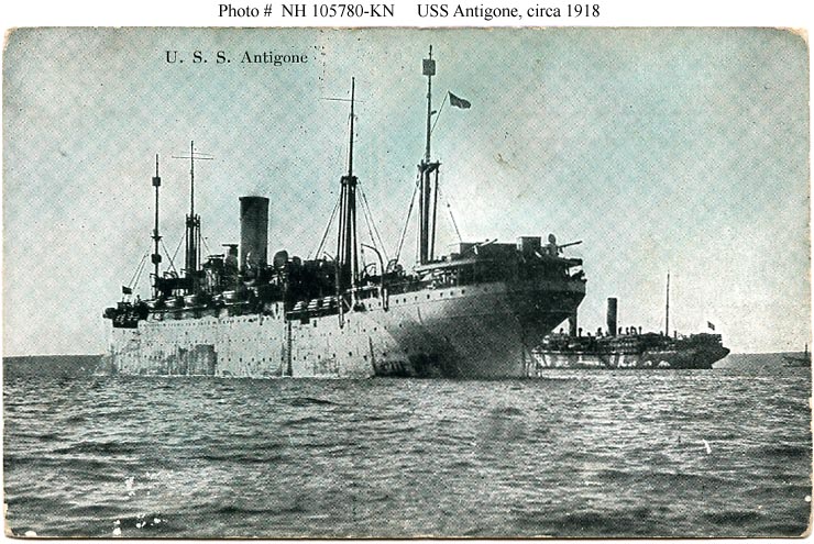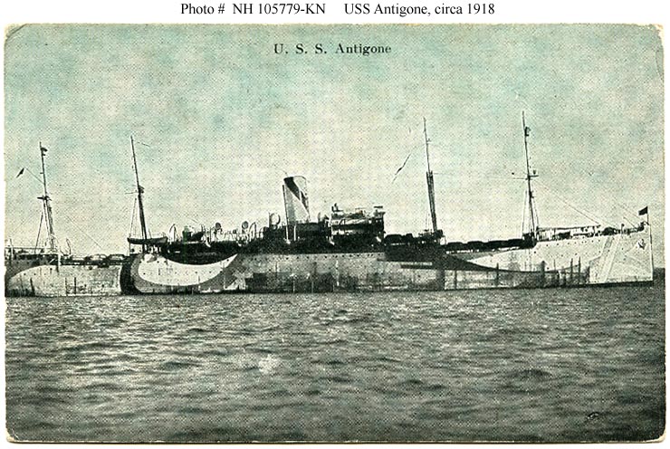 Photo #: NH 106642 USS Antigone (ID # 3007) In port, 1919. The original image is printed on post card ("AZO") stock. Donation of Charles R. Haberlein Jr., 2009. U.S. Naval History and Heritage Command Photograph. Online Image: 93KB; 900 x 565 pixels |