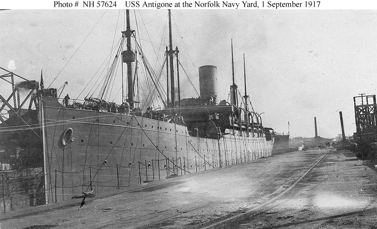 Photo #: NH 57624 USS Antigone (ID # 3007) At the Norfolk Navy Yard, Virginia, on 1 September 1917, the day her name was changed from Neckar and five days before she was placed in commission. U.S. Naval History and Heritage Command Photograph. Online Image: 93KB; 740 x 450 pixels |