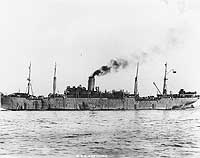 Photo #: NH 57625 USS Antigone (ID # 3007) In the Norfolk harbor, Virginia, on 29 November 1917. A destroyer silhouette is painted on her side to give the illusion that she is being closely convoyed. A tug is passing by the after part of the destroyer silhouette. Donation of Mr. Marshall Butt, Norfolk Naval Shipyard Museum. U.S. Naval History and Heritage Command Photograph. Online Image: 82KB; 740 x 595 pixels |
