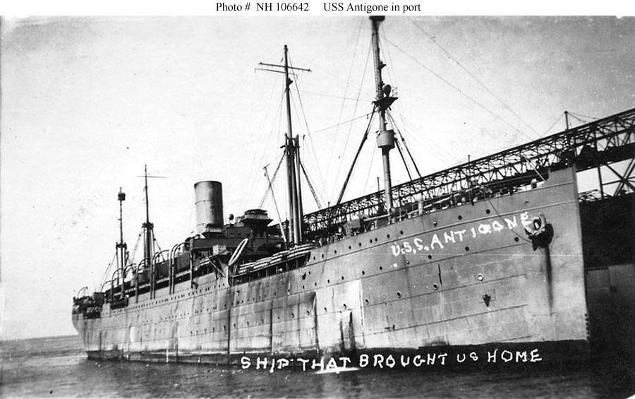Between mid-December 1917 and the end of the fighting in November 1918, Antigone made eight round-trip voyages to France, carrying cargo and over 16,000 troops to the war zone. After the Armistice she reversed the flow, bringing more than 22,000 men home from Europe by September 1919, when she was decommissioned. Antigone was then turned over to the War Department for operation as a U.S. Army transport.