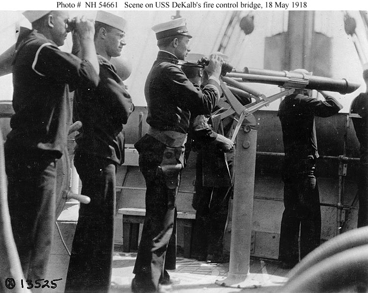 Photo #: NH 54660 USS DeKalb (ID # 3010) Scene on the ship's fire control bridge, 18 May 1918. Note man at speaking tube at left, officer with binoculars in the center, and telescope at right. U.S. Naval Historical Center Photograph. Online Image: 103KB; 740 x 550 pixels |