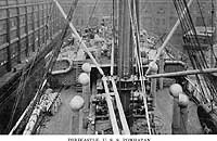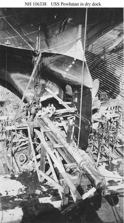 In dry dock at Newport News, Virginia, 1919, with her port propeller shaft pulled out for maintenance.