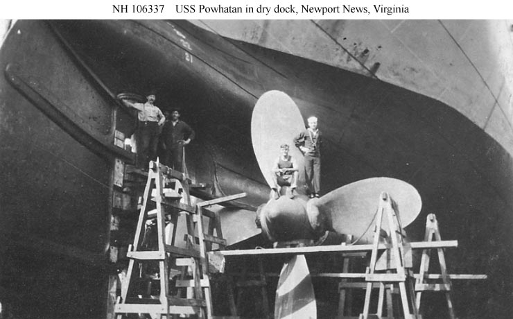 Note men standing on her starboard four-bladed propeller, water line painted on her hull, and the ship's rudder at left.