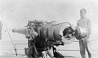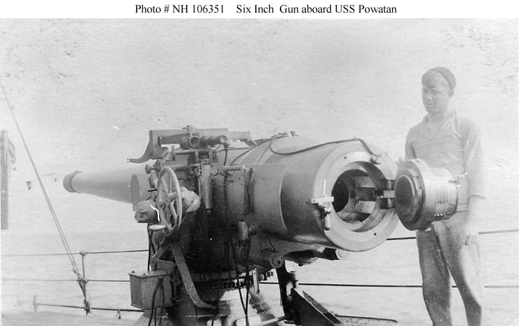 Sailor standing by the open breech of one of the ship's six-inch guns, 1919.